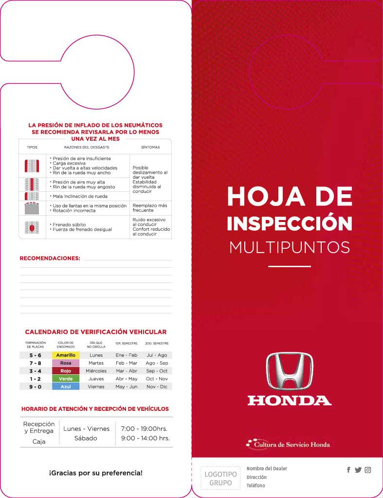 La hoja multipuntos te da una referencia del estado de tu Honda, es llenado por técnicos certificados y entregado después de tu servicio como recordatorio de los puntos de atención para tu próxima visita, tu Asesor de Servicio te brindara una explicación detallada de la hoja.